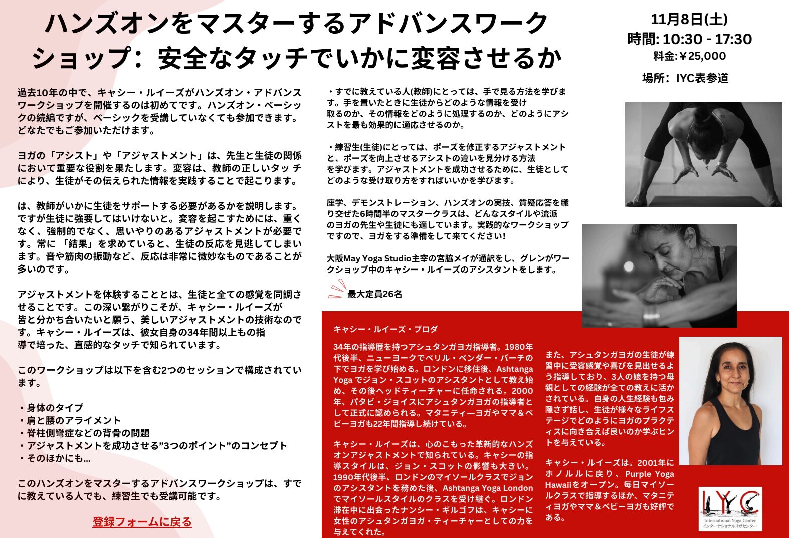 キャシーは、長年アシュタンガヨガを練習してきて、なかなか理解できなかったアーサナ(ポー ズ)を、嚙み砕いてわかりやすく教えてくれます。それぞれのアーサナが心身に与えるインパク トと深さを理解させてくれる先生でもあります。そしてそれぞれの能力あったアーサナへの挑 戦方法をわかりやすく、かつ心身に無理なく(ケガをしない様に)教えてくれます。
