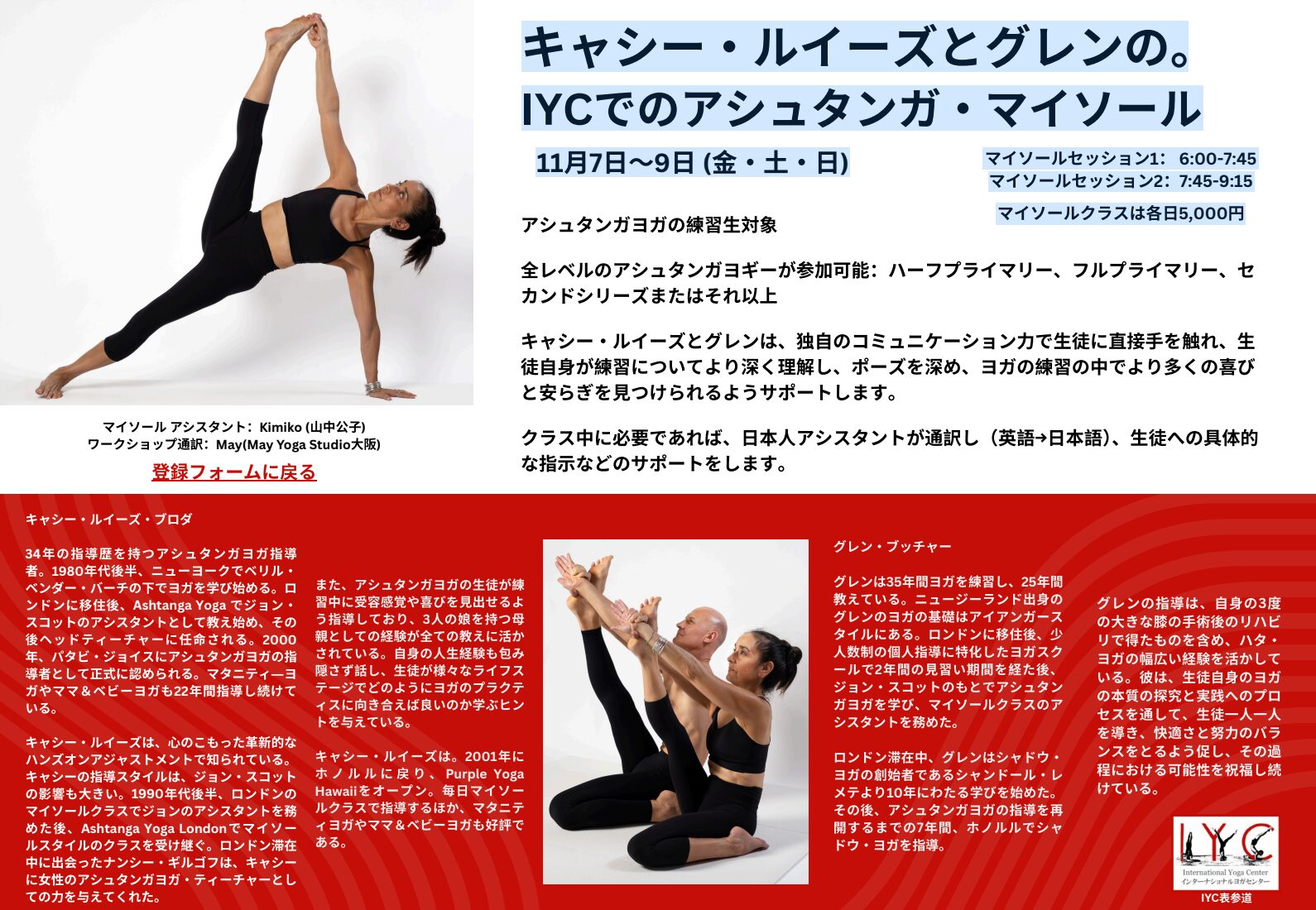 【表参道】キャシー・ルイーズとグレン: IYCでのアシュタンガ・マイソール マイソールセッション1 : 6:00-7:45 マイソールセッション2 : 7:45-9:15 マイソールクラスは各日5,000円 11月7日~9日 (金・土・日)