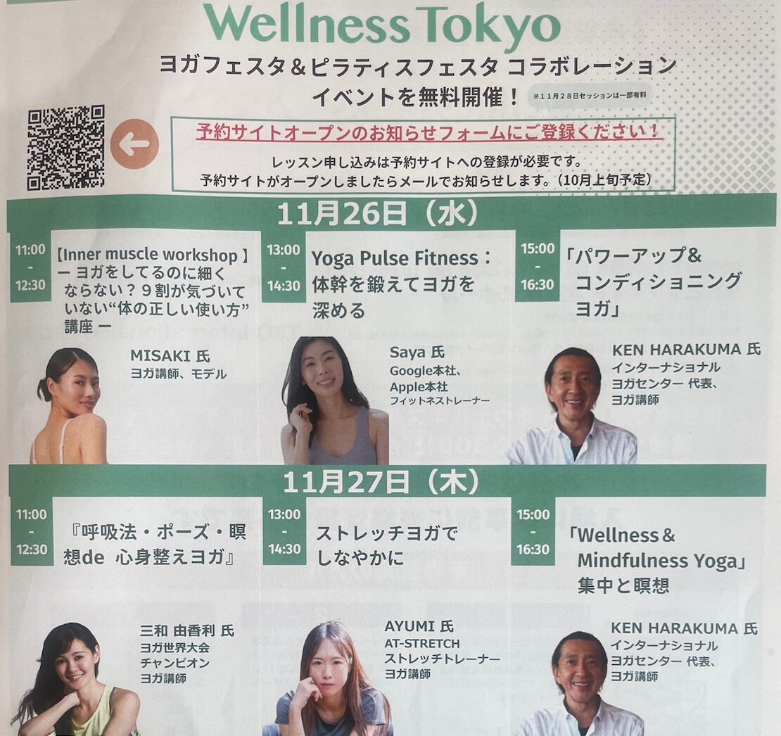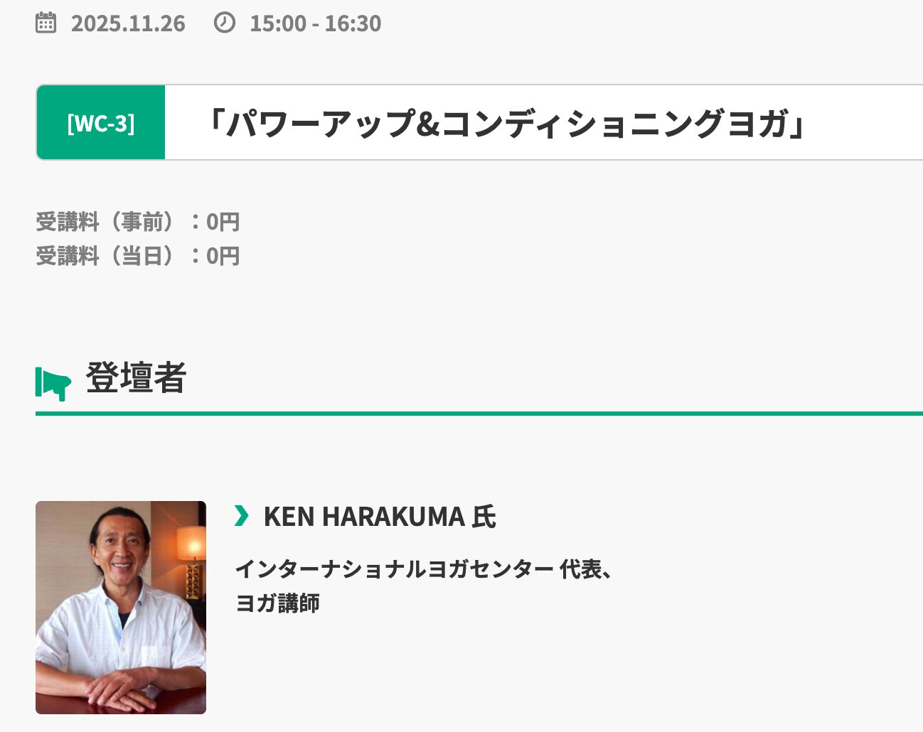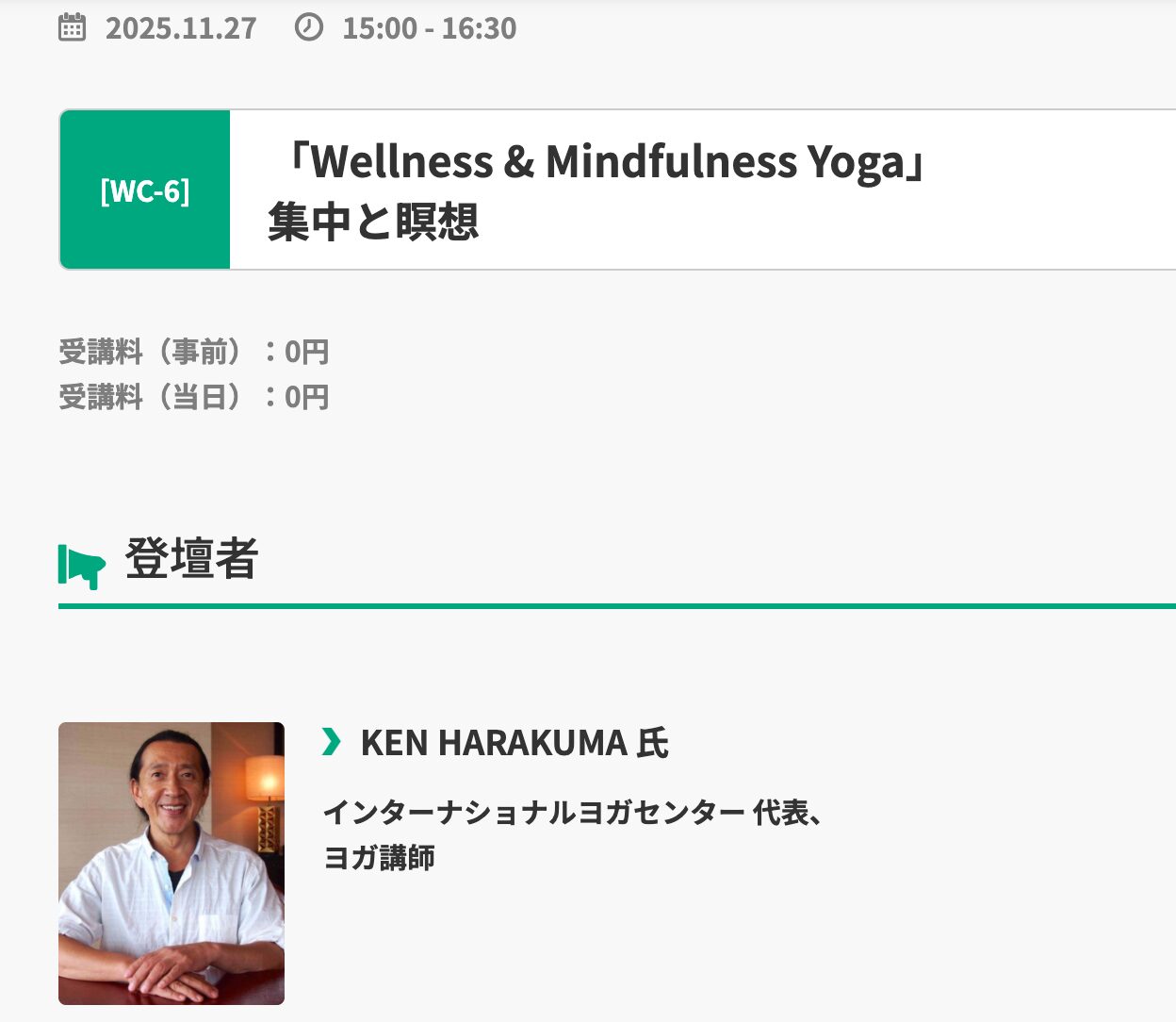 【東京ビックサイト】参加費無料:Wellness Tokyo(WT) 2025/11/26(水)-11/27(木) ケンハラクマ2クラス他、4名ヨガ講座出演決定‼️