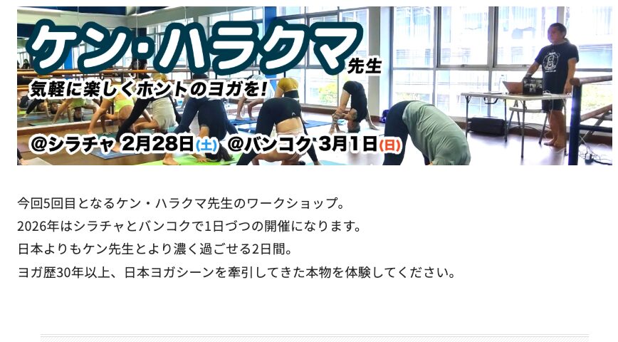 今回5回目となるケン・ハラクマ先生のワークショップ。2026年はシラチャとバンコクで1日づつの開催になります。日本よりもケン先生とより濃く過ごせる2日間。ヨガ歴30年以上、日本ヨガシーンを牽引してきた本物を体験してください。【2月28日(土) @シラチャ】 ⭐️A:アシュタンガヨガ 初心者向け基礎講座+誰でもできる!レッド・ハーフプライマリー+α(3時間)⭐️ B:マインドフル瞑想&呼吸法(1時間) ⭐️C:エナジーフロー&ウェルネスヨガ短期集中講座(修了証授与)(4時間) 【3月1日(日) @バンコク】 ⭐️D:アシュタンガヨガ マイソールスタイル(2時間) ⭐️E:前屈・後屈のコツ集中講座[ドロップバック・カムアップ含む](1.5時間) ⭐️ F:解剖学&アラインメントヨガ集中講座(修了証授与)(4時間)⭐️ G:ヒーリング&快眠ヨガ+サイレント瞑想(1時間)❣️ ・タイならではのおトクな料金設定になっています。 ・全クラスZOOMによるオンラインで受講可能(お申し込み時にお知らせください)。 ・定員になり次第締め切ります。 ・クラス内容は変更になる場合がございます。❤️❤️❤️ ヨガ初心者の方も大歓迎❣️