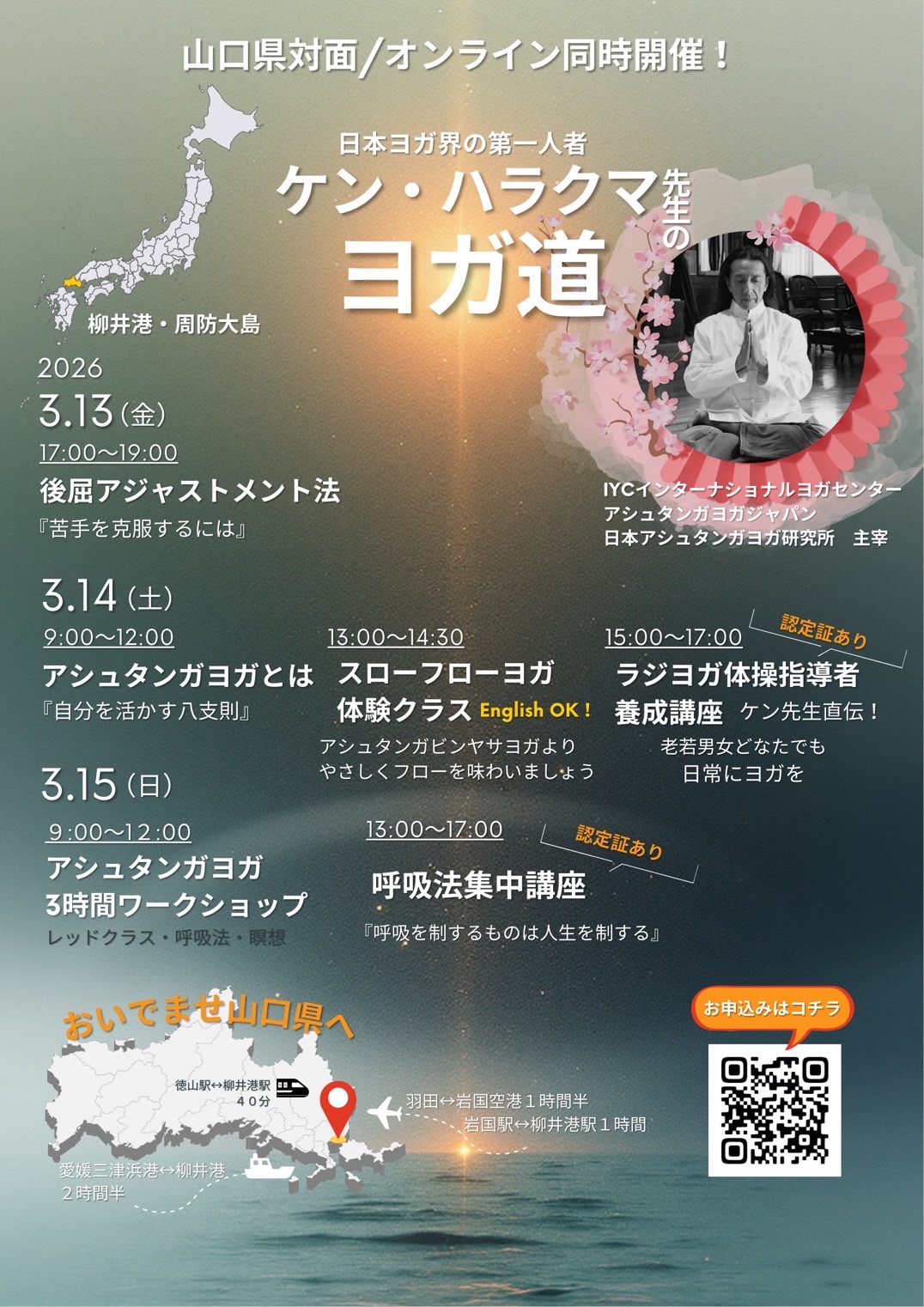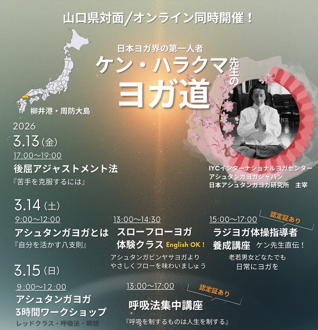 【山口 & ZOOM】ヨガ道特別講座 3月13,14,15日(3日間)ケン・ハラクマ先生直接指導‼️