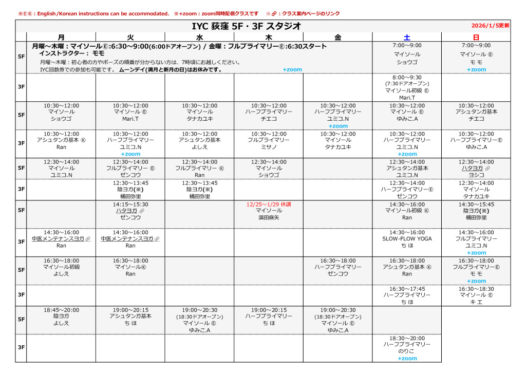 - 参加したいクラスのスケジュールを確認します。荻窪スタジオでは、事前のご予約は必要ありません。
