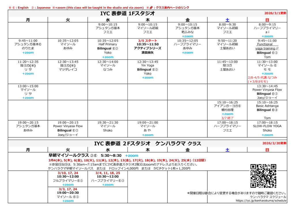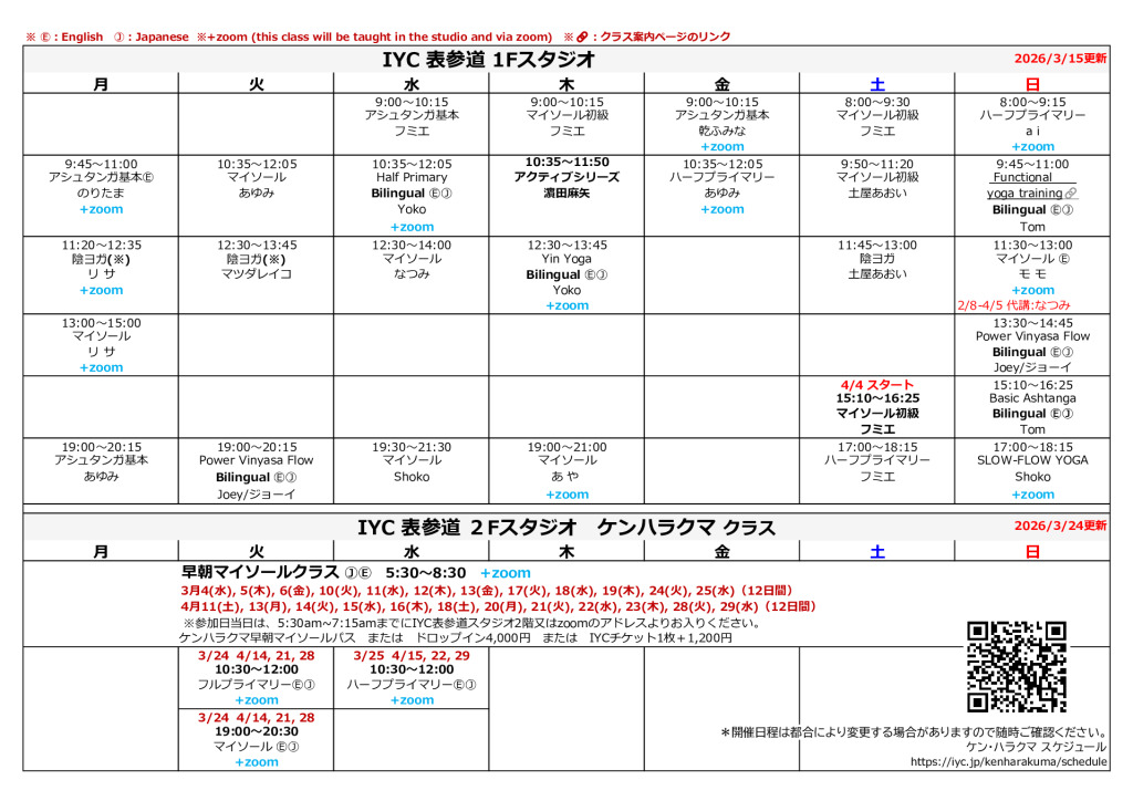 クラスの代講・休講・変更は、代講情報ページhttps://iyc.jp/daikou をご確認ください。